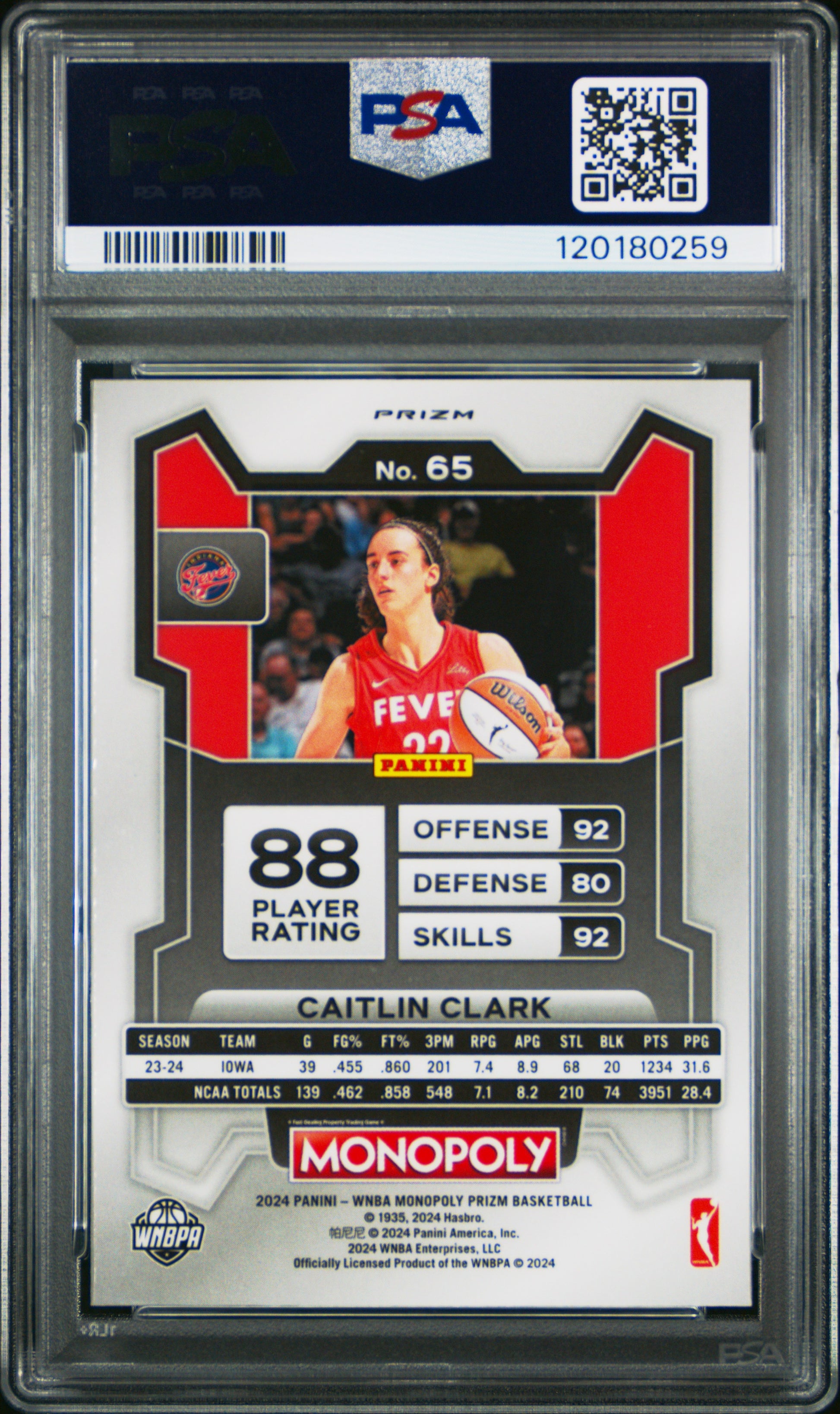 Caitlin Clark Fever 2024 Prizm Monopoly Red Classic Icon Rookie Card #65 PSA 10