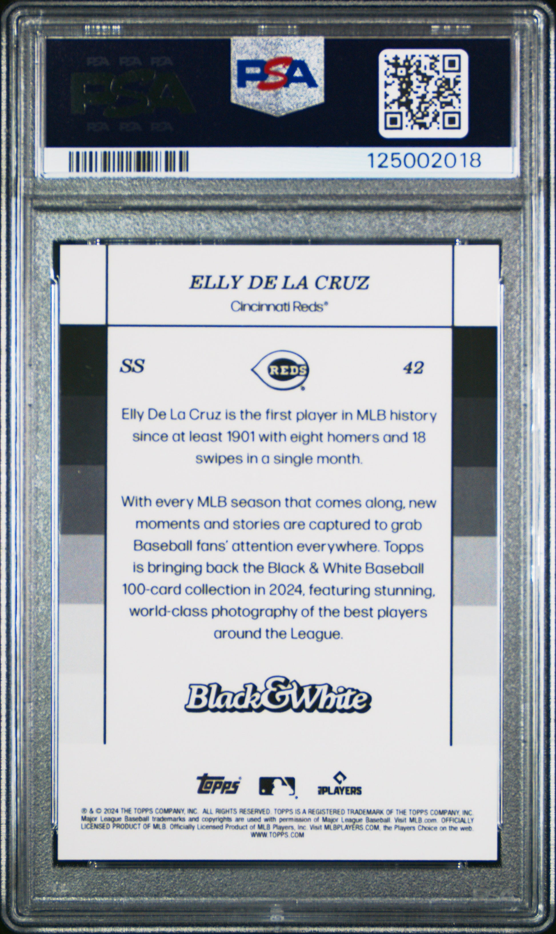 Elly De La Cruz Cincinnati Reds 2024 Topps Black & White Rookie Card #42. This card has been professionally slabbed and graded by PSA as a Gem Mint 10.